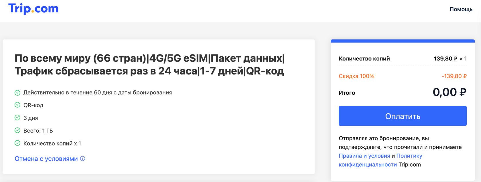 Trip.com предлагает недорогие eSIM и мобильный интернет по всему миру, но несмотря на то, что цены на есим у Трип.ком итак ниже, чем у конкурентов, еще и регулярно проводятся акции со скидками на есим, например, акции с предложением есим для Китая и Таиланда за 1 рубль (и это не миф, я покупала такую есим для Китая - см. фото в конце страницы).